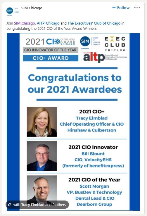 The law firm of Hinshaw & Culbertson LLP is pleased to announce that Chief Information and Operations Officer Tracy Elmblad has been selected the 2021 CIO+ of the Year by the Society of Information Management (SIM) Chicago Chapter. Scott Morgan of Dearborn Group was named CIO of the Year, while Bill Blount of VelocityEHS received the CIO Innovators Award. The awards were presented at a virtual award ceremony on October 14, 2021.