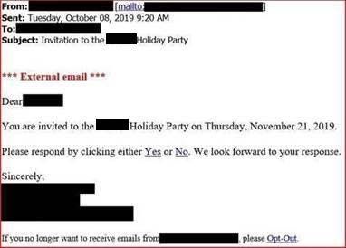 Phishing emails masquerading as holiday party invitations are growing in popularity, and when malicious actors include other techniques such as email spoofing, the resulting email can be difficult to differentiate from legitimate communications. The screenshot below shows an example of a phishing email you may receive during the holiday season. The sender claims the email is an invitation to a firm holiday party, and by clicking on one of the two links within the email, the recipient can RSVP. In reality, clicking either link will result in the installation of malicious software.
